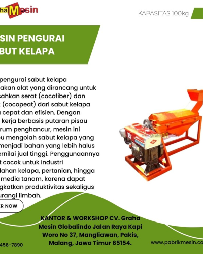 Mesin pengurai sabut kelapa adalah alat mekanis yang dirancang untuk menguraikan sabut kelapa menjadi serat halus (cocofiber) dan serbuk (cocopeat). Mesin ini bekerja menggunakan sistem pemukul atau pengurai berputar yang mampu menghancurkan struktur sabut kelapa yang keras menjadi bagian-bagian yang lebih halus dan terpisah. Hasil dari proses ini dapat dimanfaatkan untuk berbagai kebutuhan seperti bahan baku industri, media tanam, hingga produk ekspor.