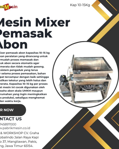 Mesin mixer pemasak abon merupakan solusi tepat bagi pelaku usaha yang ingin mengembangkan bisnis abon secara lebih profesional, efisien, dan menguntungkan. Dengan mesin ini, proses produksi menjadi lebih cepat, kualitas produk lebih terjaga, dan peluang usaha dapat berkembang lebih besar.